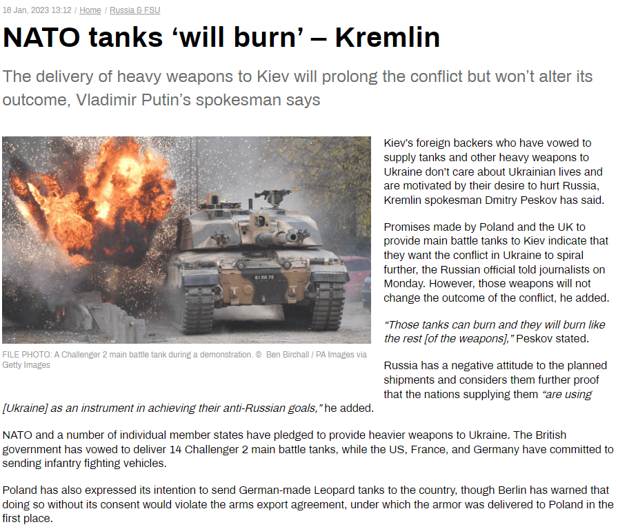 Kremlin says NATO tanks “will burn”